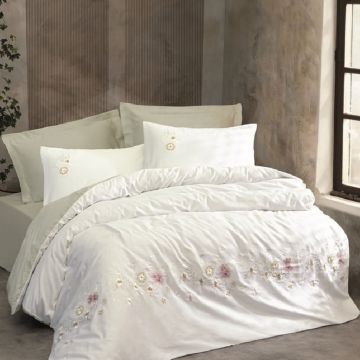 Lenjerie de pat dubla King Size cu broderie Tuffata, Heinner Home, 220x240 cm, microfibra 100 GSM, crem